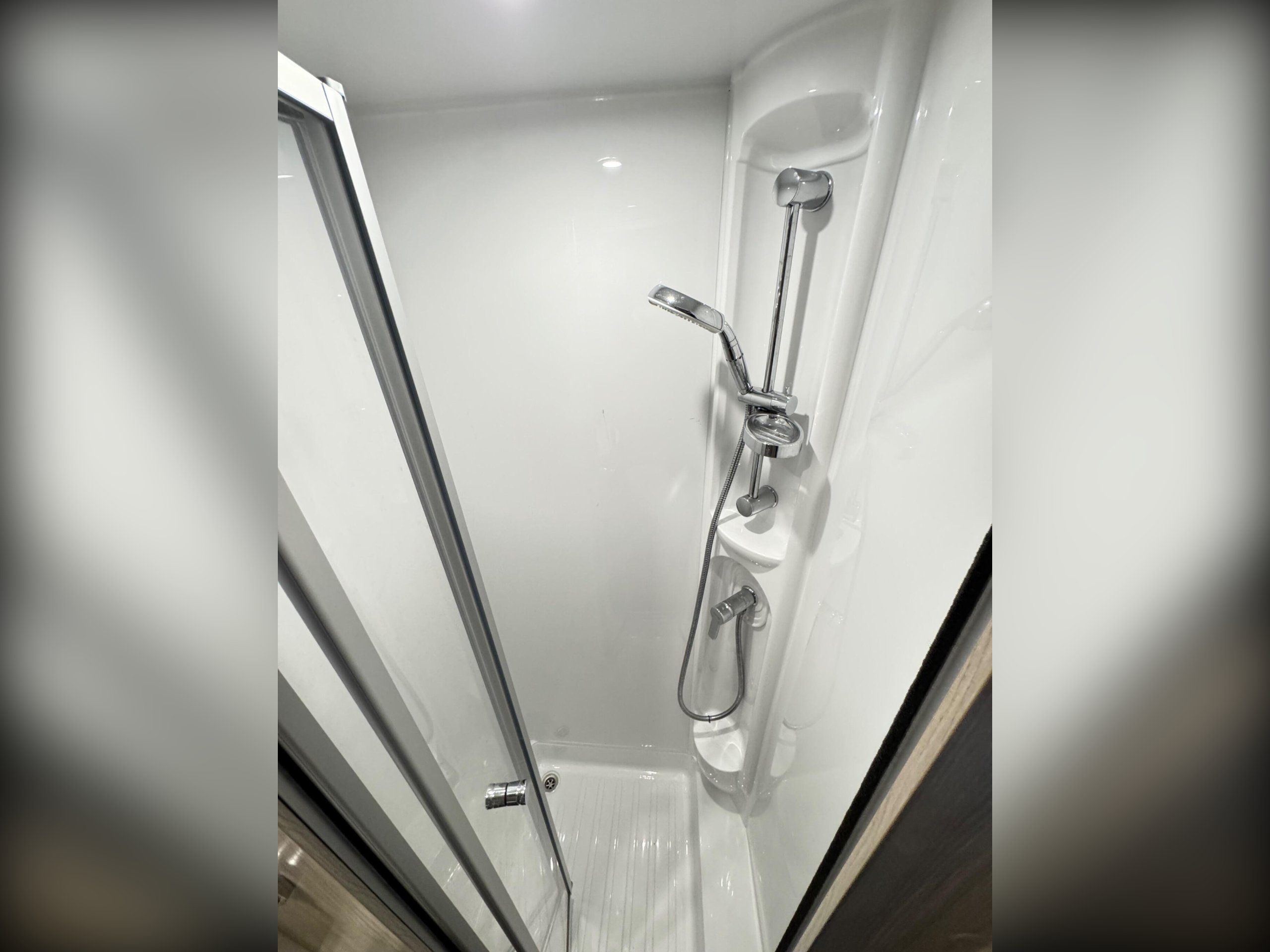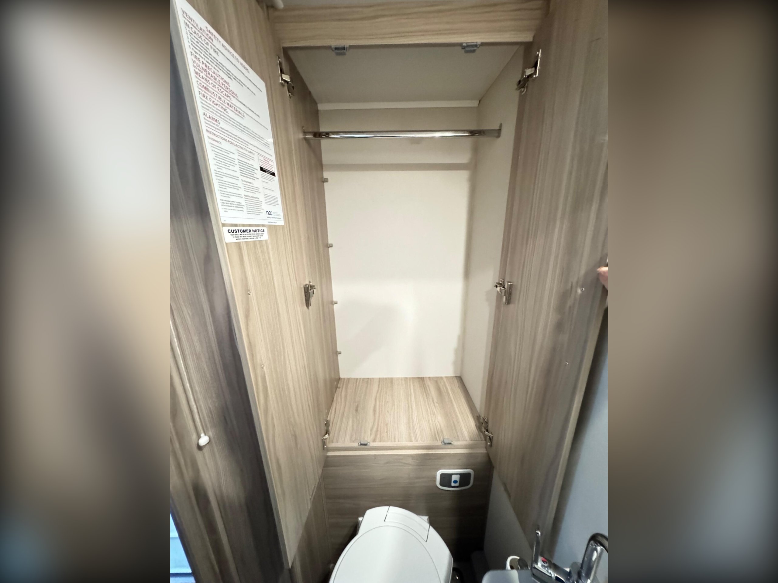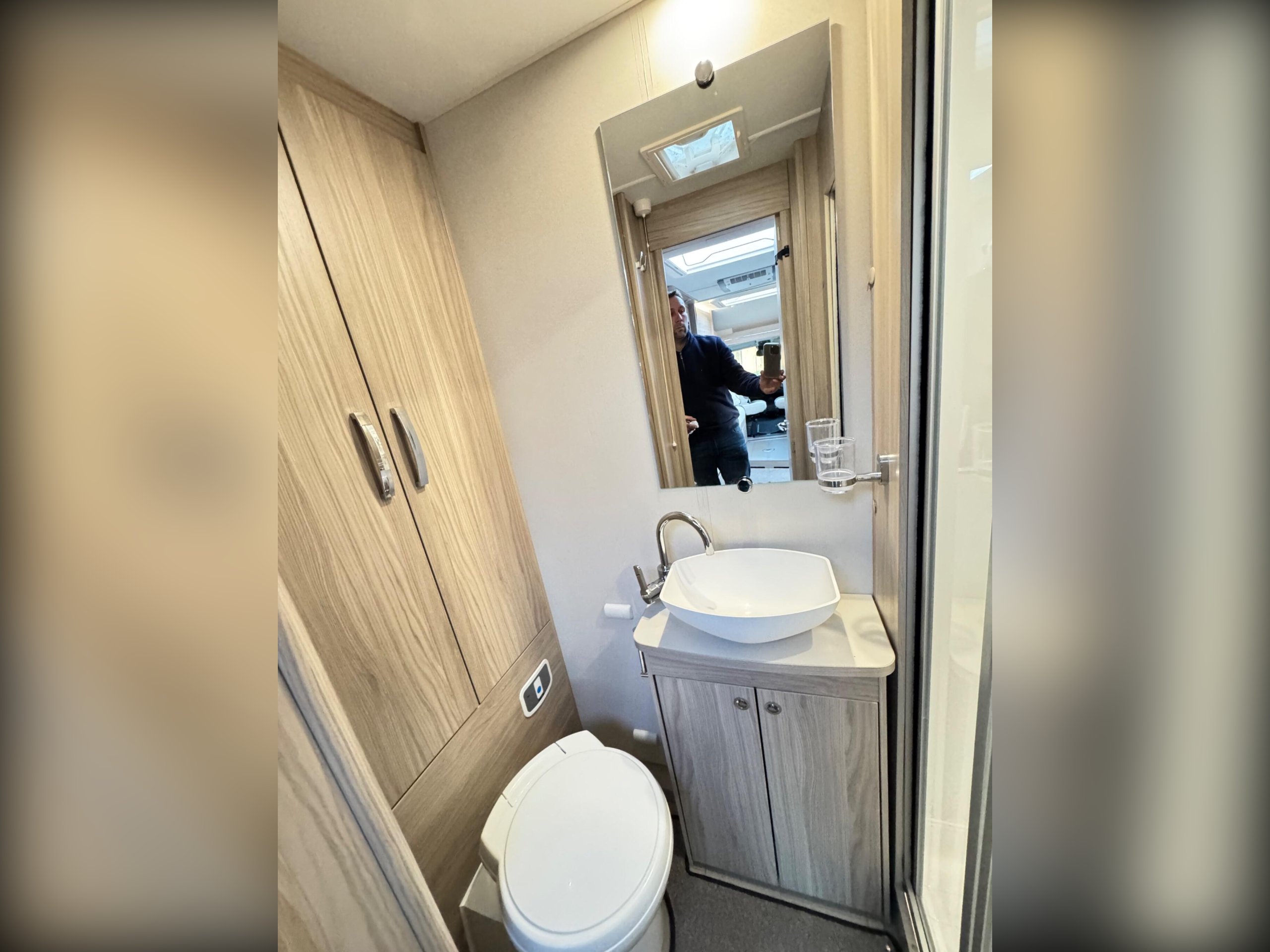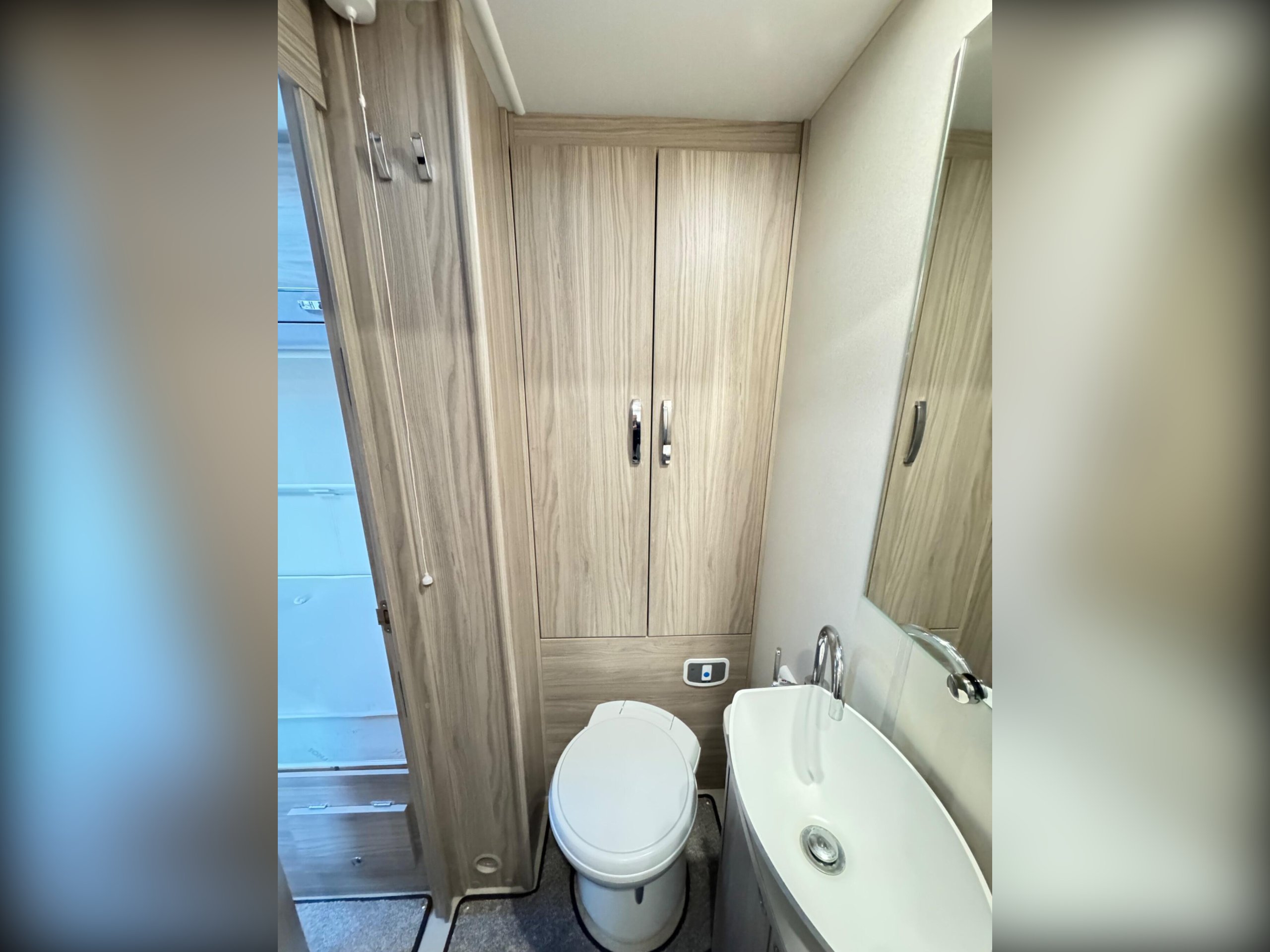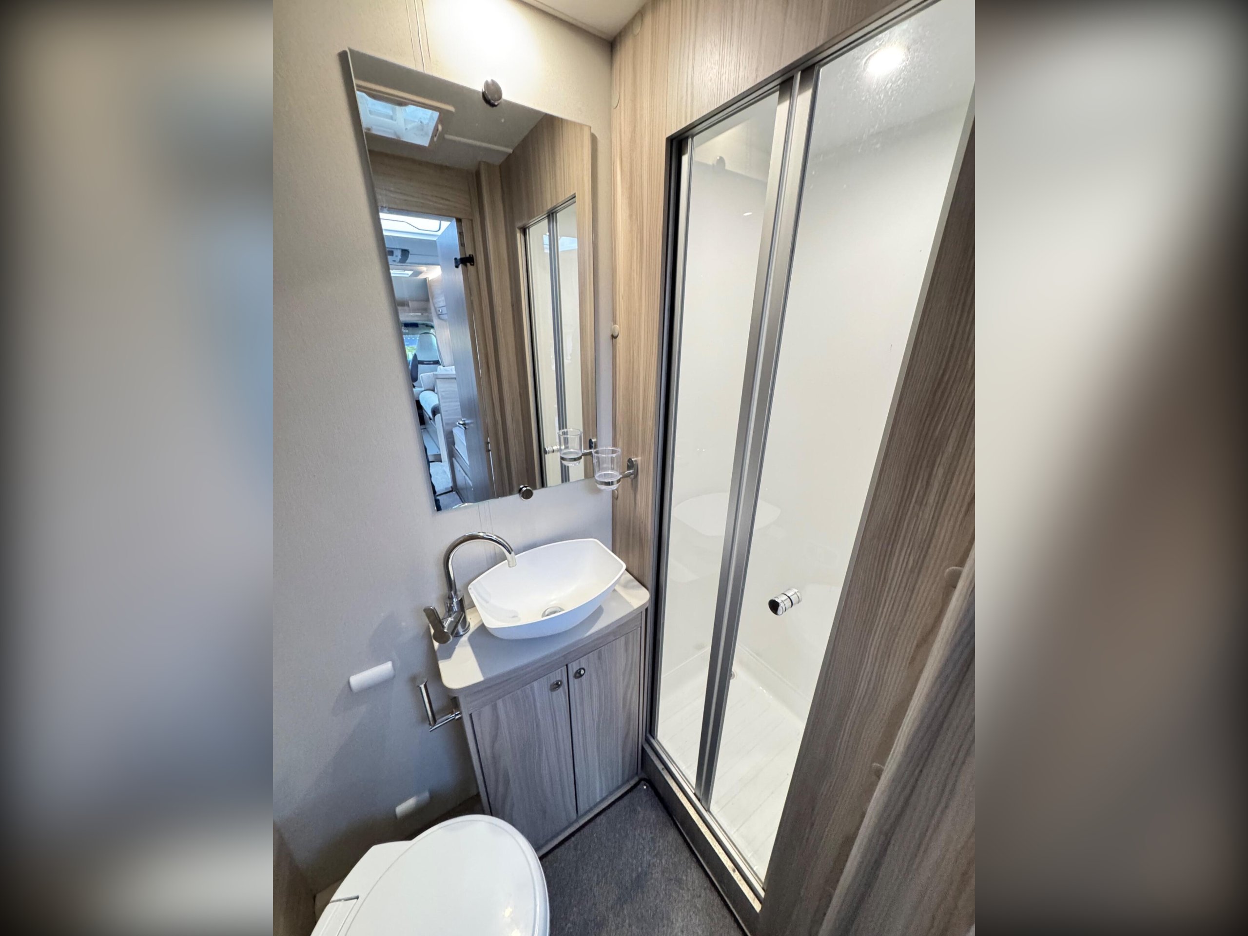 The rear bedroom area is partitioned from the front lounge with a folding screen for extra privacy. Storage is provided under the two rear fixed beds for bedding etc. At the rear in the bathroom is a wardrobe, a swivel cassette toilet, vanity wash basin and separate shower cubicle.