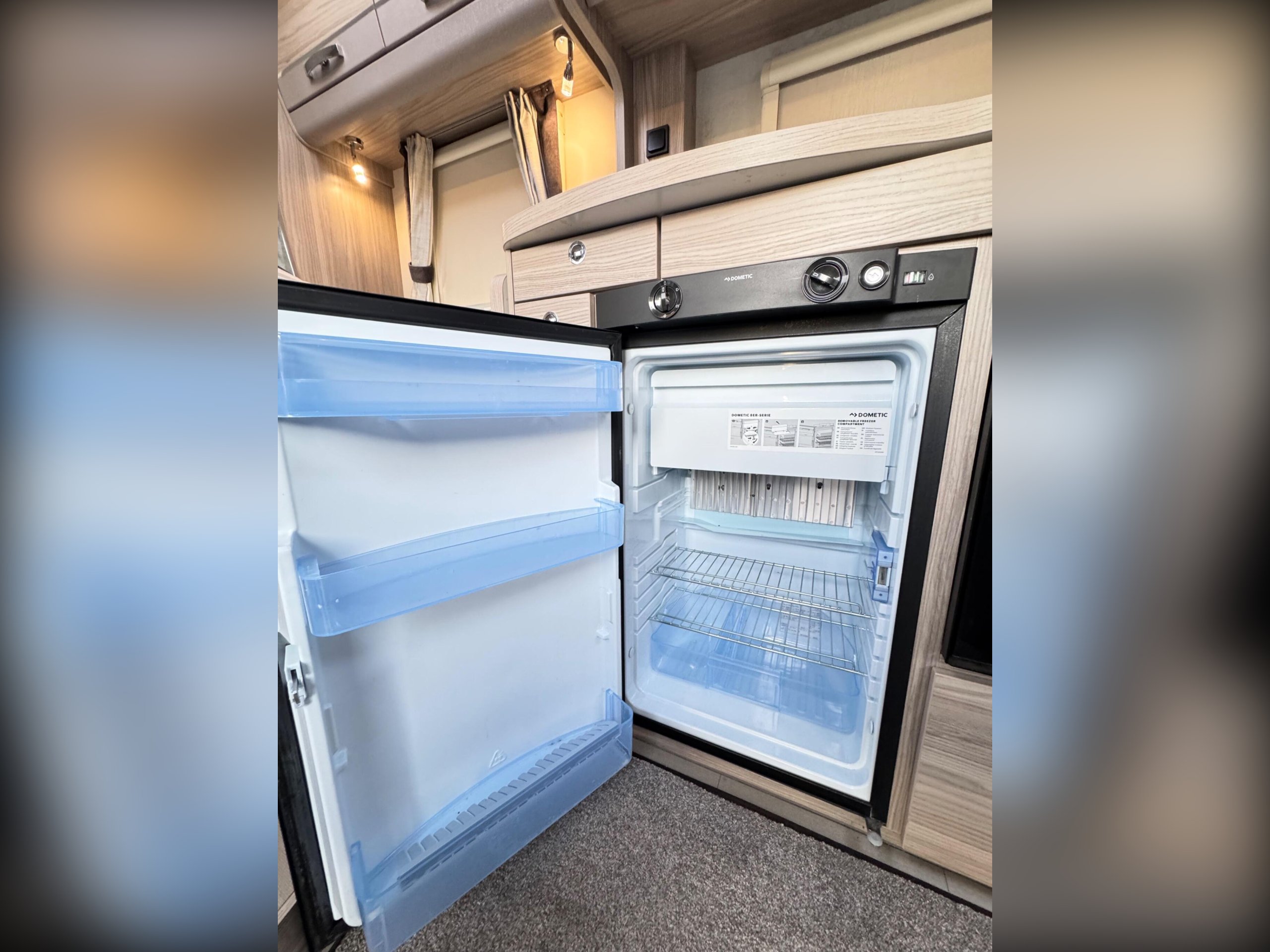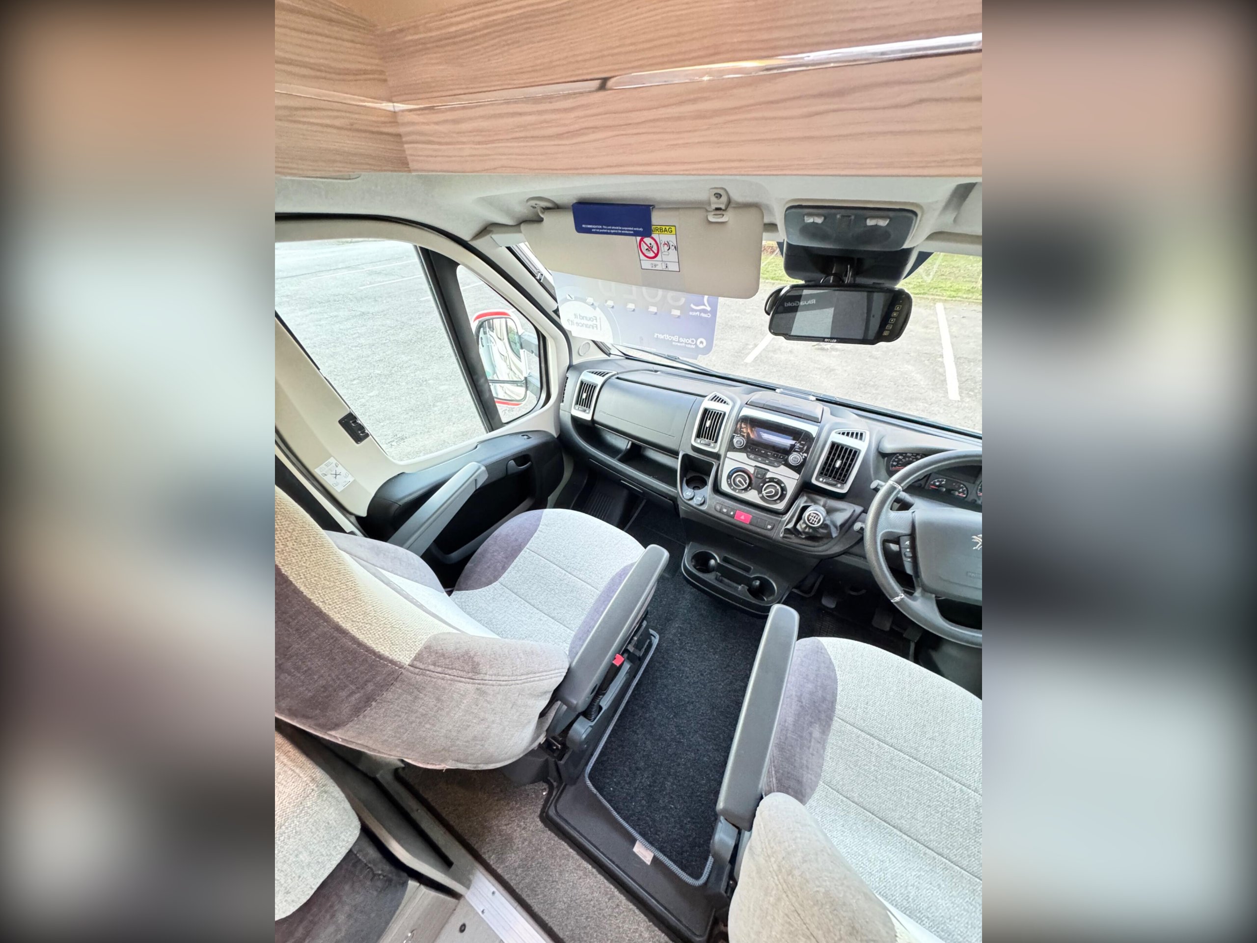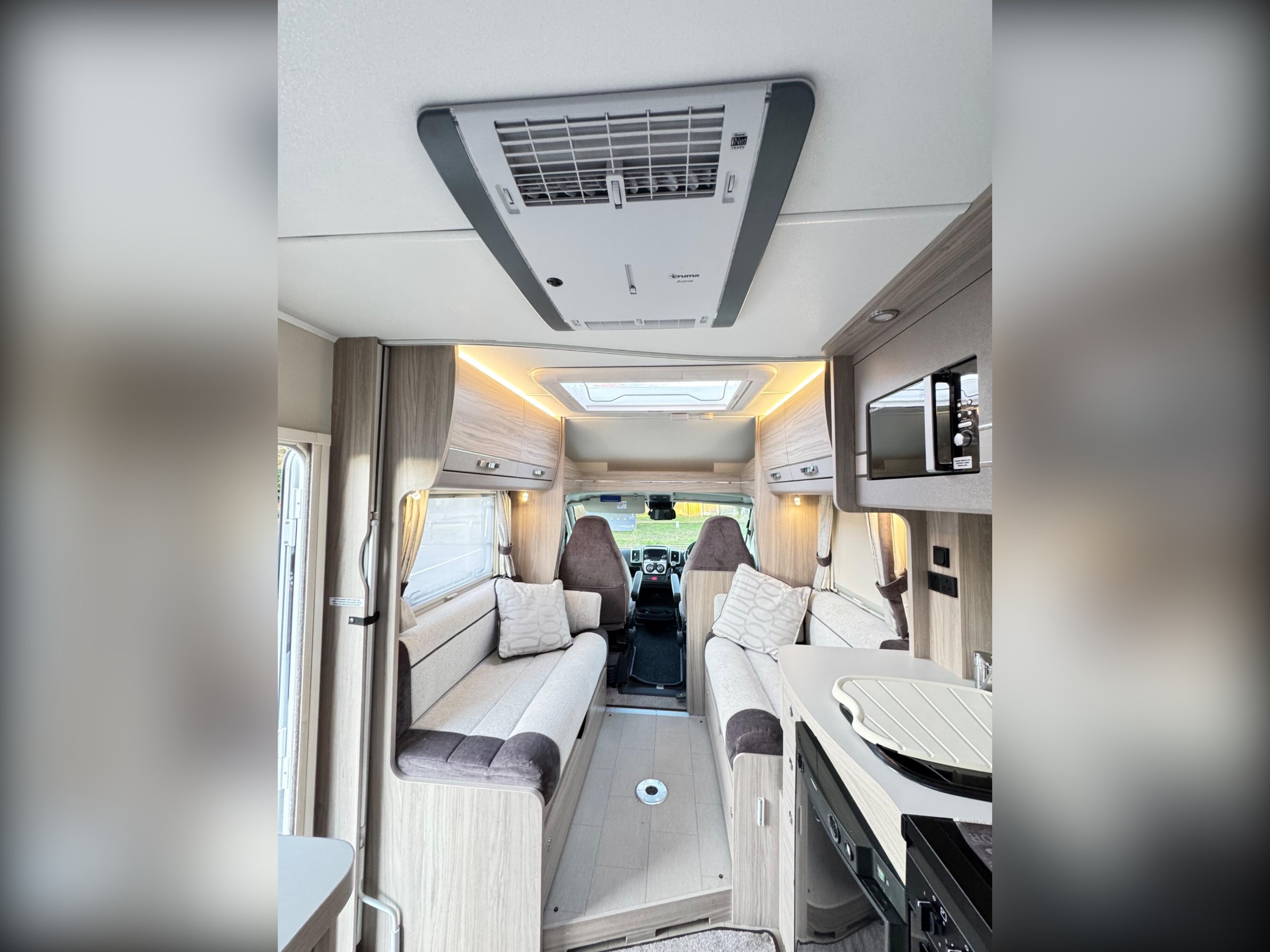 The cab has full window blinds with both driver and passenger seats able to swivel to face the dining area.
