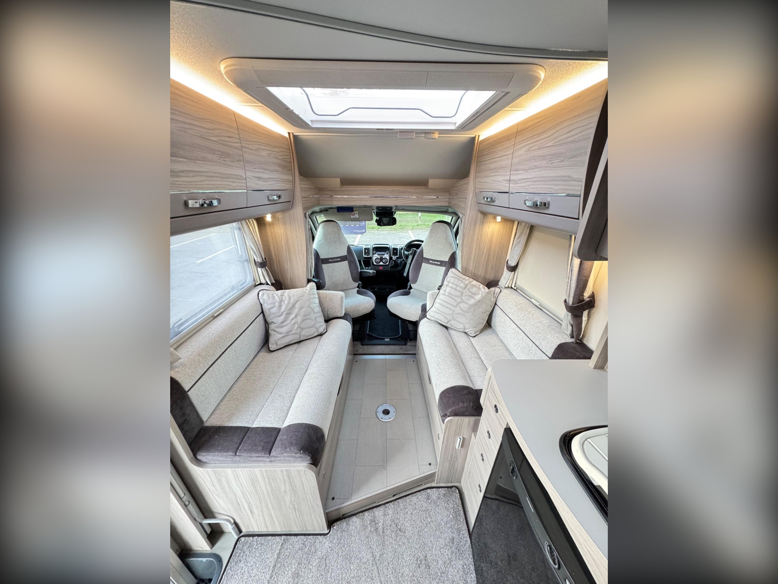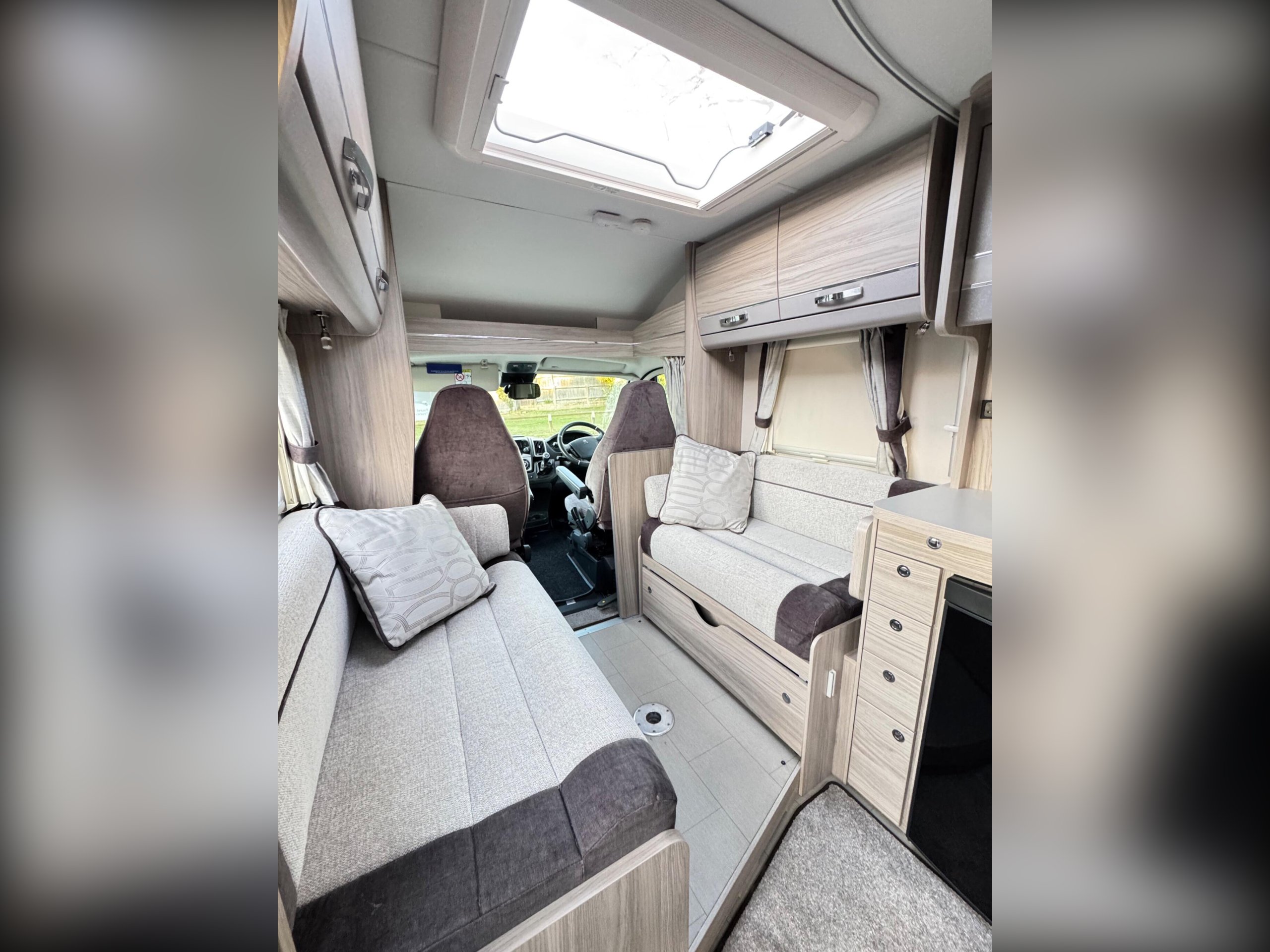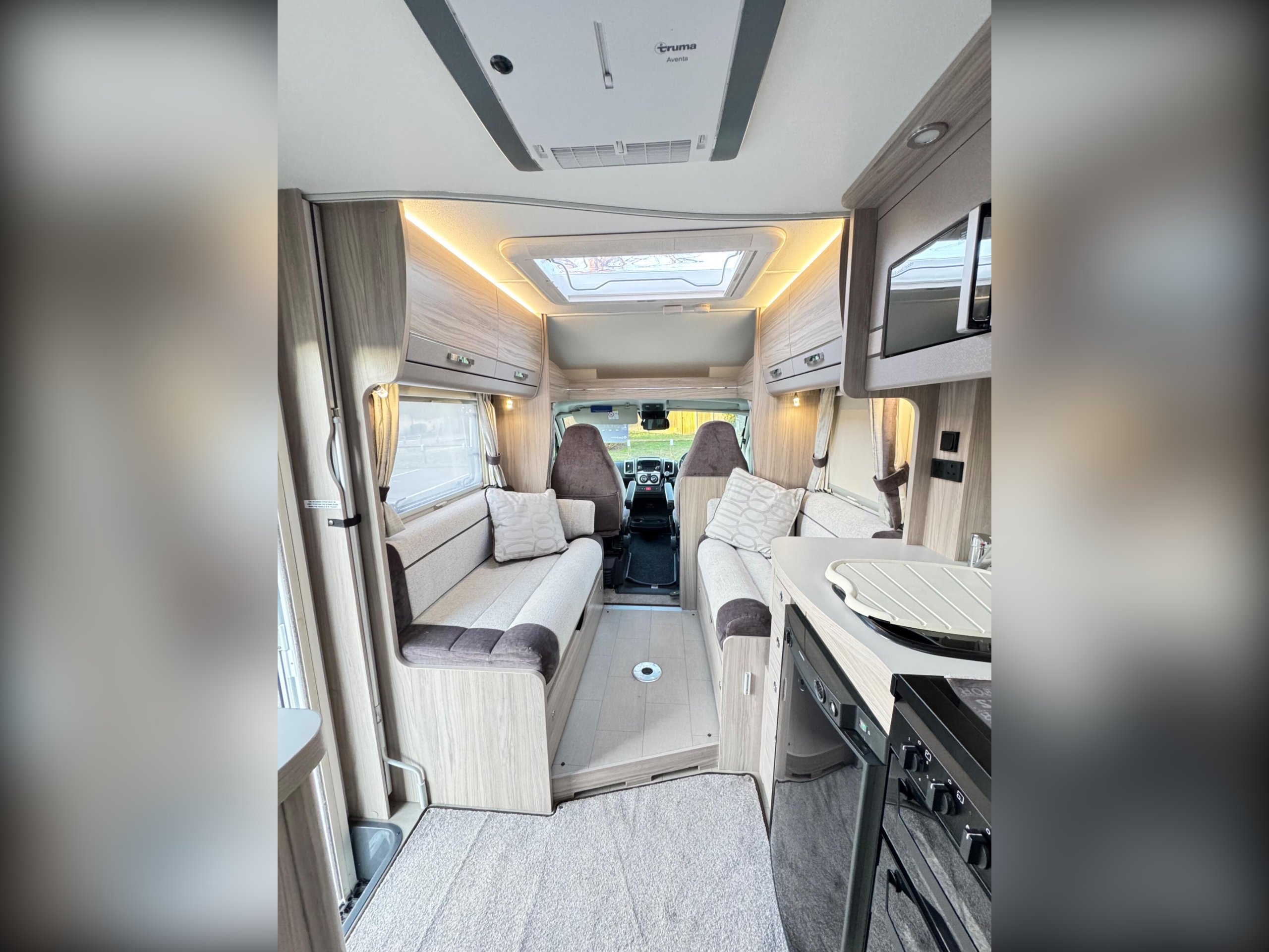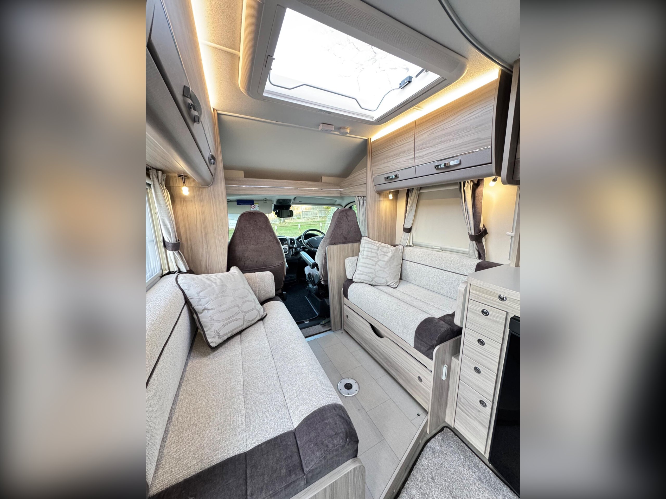 The front lounge holds two sofas that convert into a double bed. Underneath are two belted travel seats that fold away when you have reached your destination.